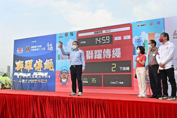 大家好!今日好高興出席由民政事務總署、國際獅子總會中國港澳303區,以及中國香港跳繩體育聯會合辦的「獅躍傳繩」青少年花式跳繩嘉年華暨傷健共融創世界紀錄活動。今日,約300名中小學生和傷健人士,將合力創造新的跳繩世界紀錄,相信大家都非常興奮和期待。