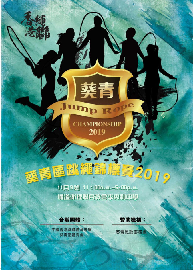 由葵青區體育會、中國香港跳繩體育聯會合辦、葵青區議會贊助的「葵青區跳繩錦 標賽 2019」將於 11 月 9 日進行,賽事不但為葵青區中小學生提供交流平台互相學習切 磋,培養他們團結合作的精神,同時透過親子組的比賽項目進一步促進葵青區市民親 子關係,加強葵青區的跳繩風氣,營造健康積極的運動氛圍,推動跳繩運動普及化。