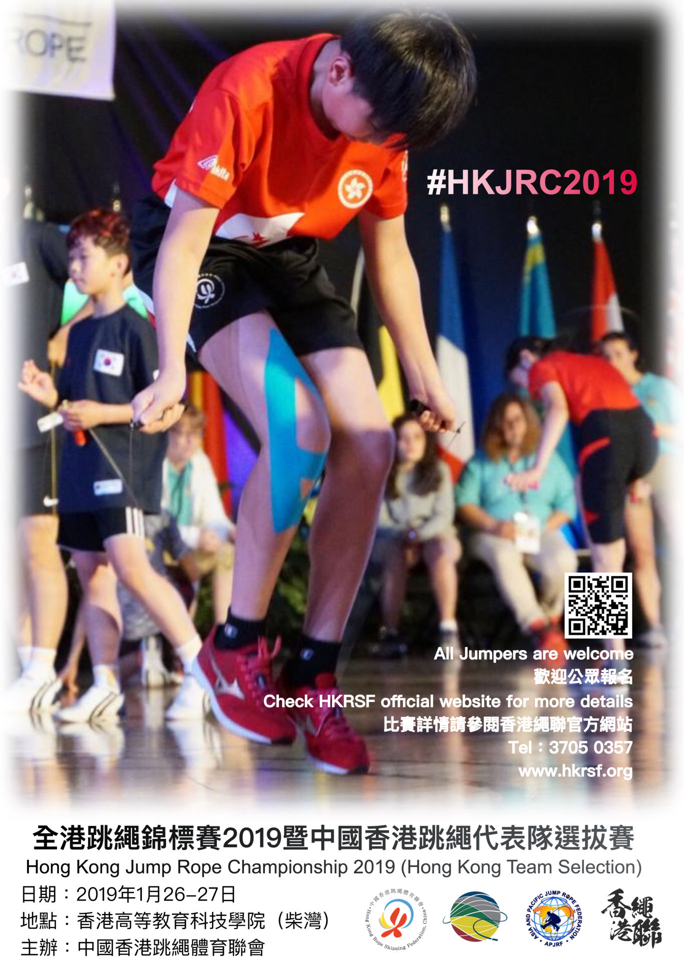 中國香港跳繩體育聯會於2019年1月26日至1月27日舉辦「全港跳繩錦標賽2019」,此賽事為世界跳繩體育聯會(World Jump Rope Federation)及亞洲及太平洋跳繩體育聯會(Asia and Pacific Jump Rope Federation)唯一認可之中國香港代表隊選拔賽,運動員參賽成績將作為入選中國香港跳繩代表隊的準則。成功入選中國香港跳繩代表隊將有機會代表中國香港參與國際跳繩比賽,包括2019年7月2日至7月12日於挪威奧斯陸舉行之「世界公開跳繩錦標賽2019」 (World Jump Rope Championship 2019)及2019年8月15至8月21日期間於韓國仁川舉辦之「亞洲及太平洋跳繩錦標賽2019」(Asia and Pacific Jump Rope Championship 2019),踏上世界舞台,與一眾世界知名運動員同場競技。