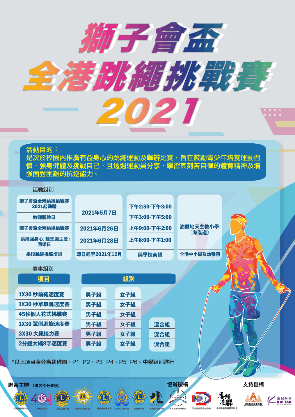 《獅子會盃全港跳繩挑戰賽2021》為一項普及跳繩運動賽事,目的是鼓勵青少年參與體能運動,提供一個平台讓跳繩愛好者同場競技,挑戰自己,追求突破。